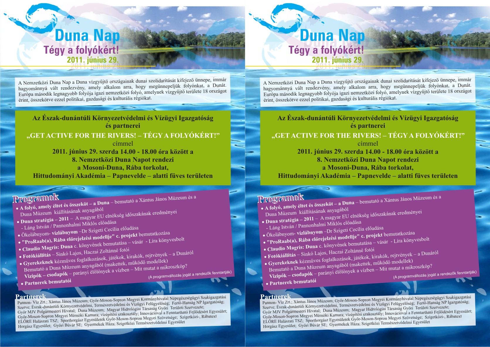Ennek az ügynek a fontosságára kíván rámutatni a győri Duna Nap-i program, ahol a Környezetvédelmi és Vízügyi Igazgatóság szakmai partnereivel egy kellemes nyári délutáni vízparti találkozóra várja a győrieket. A programok között szerepel régi dunai mesterségek bemutatója, fotókiállítás, ismeretterjesztő előadások - szó lesz a Duna stratégiáról, az ökolábnyom és vízlábnyom jelentőségéről -, lesz horgász- halász bemutató, biológiai és bakteriológiai vízvizsgálatok. Kiállításra kerül és a helyszínen megvásárolható lesz Claudio Magris Duna c. könyve. A partnerek részéről további sokszínű, sokoldalú információt talál a látogató a Dunával a vizekkel kapcsolatosan.