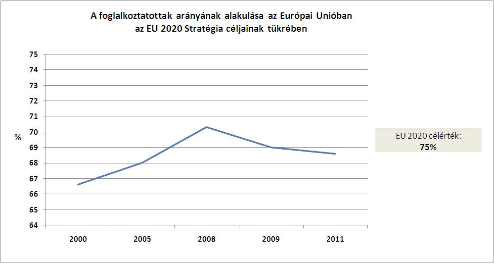 Az Eurostat adatai szerint a foglalkoztatás területén továbbra is érezteti hatását a válság: a foglalkoztatás a 2000-es, 66,6 százalékos szintről 2008-ra 70,3 százalékra emelkedett, majd 2011-ig folyamatosan 68,6 százalékra csökkent. K+F-re a tagállamok 2000-ben GDP-jük 1,86 százalékát fordították, míg 2009-ben 2,01, 2010-ben pedig kereken 2 százalékát. Az üvegházhatást kiváltó gázokkal kapcsolatban az Eurostat rámutat, hogy azok kibocsátása 1990 óta folyamatosan csökken, mostanra pedig több mint 15 százalékkal kevesebb ilyen gáz kerül levegőbe, mint 22 évvel ezelőtt. A megújuló energiaforrások felhasználását illetően a luxemburgi hivatal rámutat, hogy 2004-ben még csak a teljes energiafelhasználás 8,1 százalékát fedezték az uniós tagországok megújuló forrásokból, 2010-ben pedig mintegy 12,5 százalékát. Az oktatás területén kitűzött célokkal kapcsolatban a most közzé tett statisztikai adatok tanúsága szerint a 18 és 24 év közöttieknek 2005-ben valamivel kevesebb mint 16 százaléka hagyta ott idő előtt az iskolát, míg 2011-ben 13,5 százalékuk nem fejezte be megkezdett tanulmányait. A felsőoktatási végzettség területén elért haladást illetően az adatokból az derül ki, hogy 2005-ben a vizsgált népesség 28 százaléka, míg a tavalyi évben már 34,6 százaléka rendelkezett valamilyen diplomával. A 2005 és 2010 közötti években az Eurostat adatai szerint több mint 8 millióval csökkent azoknak a száma az Európai Unió területén, akik a szegénységi küszöb alatt élnek.