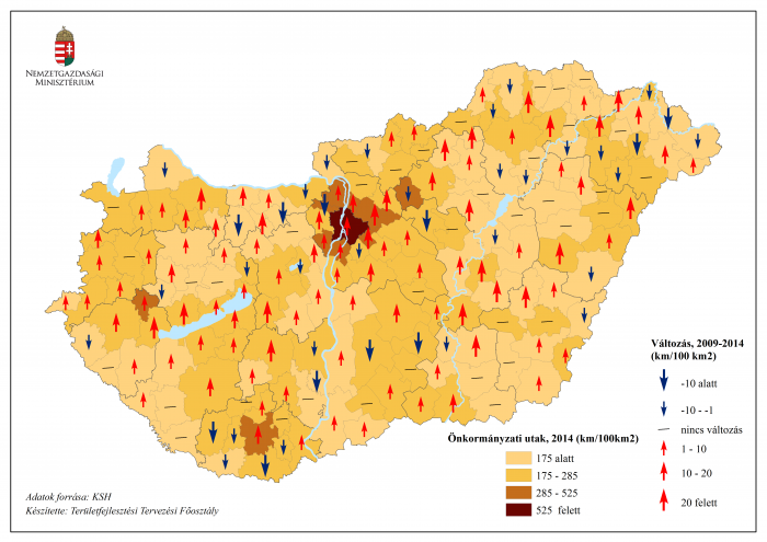 • Önkormányzati belterületi utak kiépítettsége (2014) és változása (2009-2014)