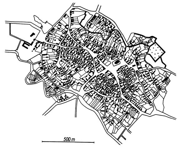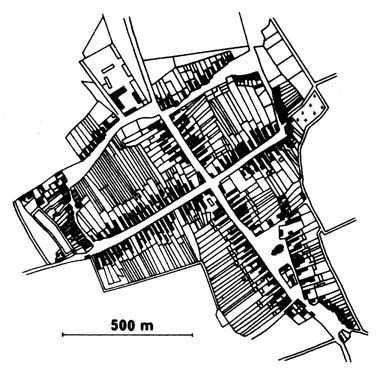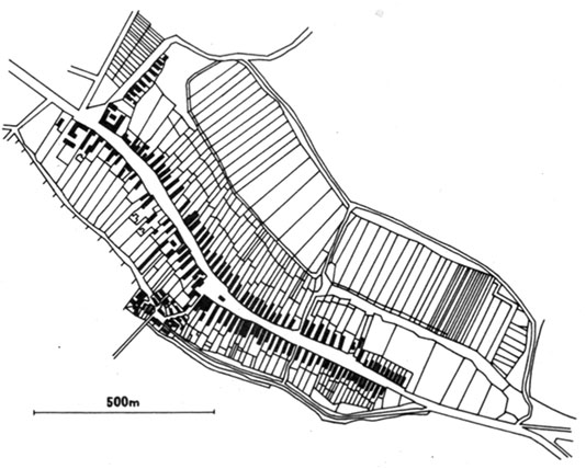 Orsós utcájú falu: olyan település, amelynek szalagtelkei egy térszerűen kiszélesedő, majd fokozatosan újra elkeskenyedő utcát fognak közre. A két sorban fekvő telkek csak a lakóház helyét, a gazdasági udvart és az esetleges kertet foglalják magukba. A szántók elkülönülnek a belsőségtől. A középkori eredetű orsós utcájú falu különösen Németország északi területein gyakori és általában a körfalvak evolúciójából eredeztetik kialakulását. Több É-mo.-i civitás és mezőváros piacutcája orsós utcának tekinthető (pl. Kassa, Szepsi).