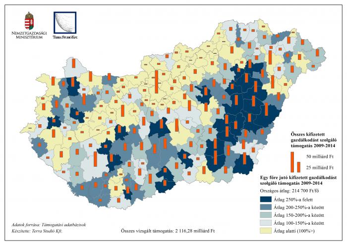 Az egy főre jutó összes kifizetett (fejlesztési célú és „gazdálkodást szolgáló”) támogatás területi különbségei, 2009-2014